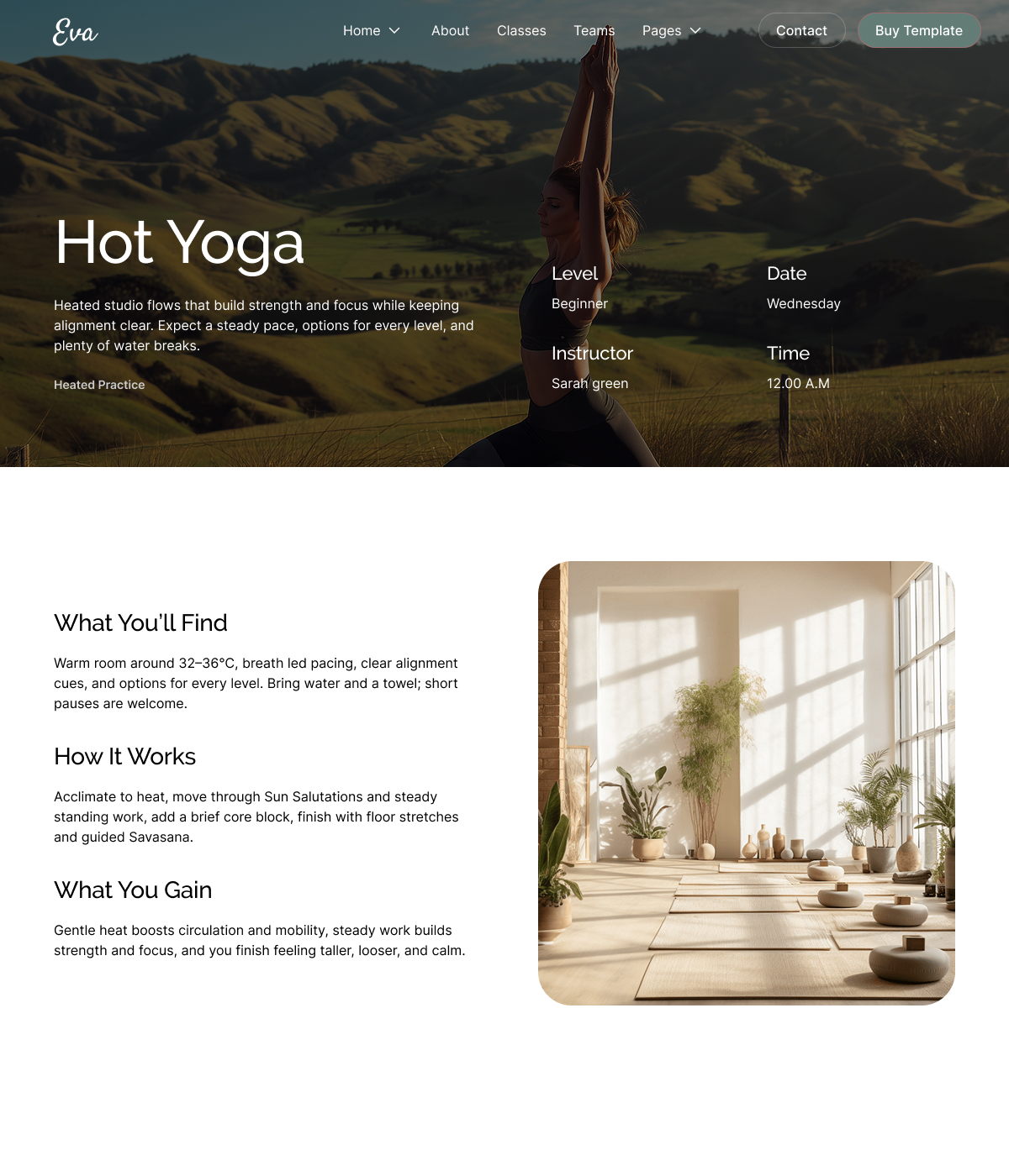 Publish with confidence with the Eva Yoga & Pilates Webflow Template. Two homepage options, classes, and a blog structure are ready. Add your content and keep the design consistent.